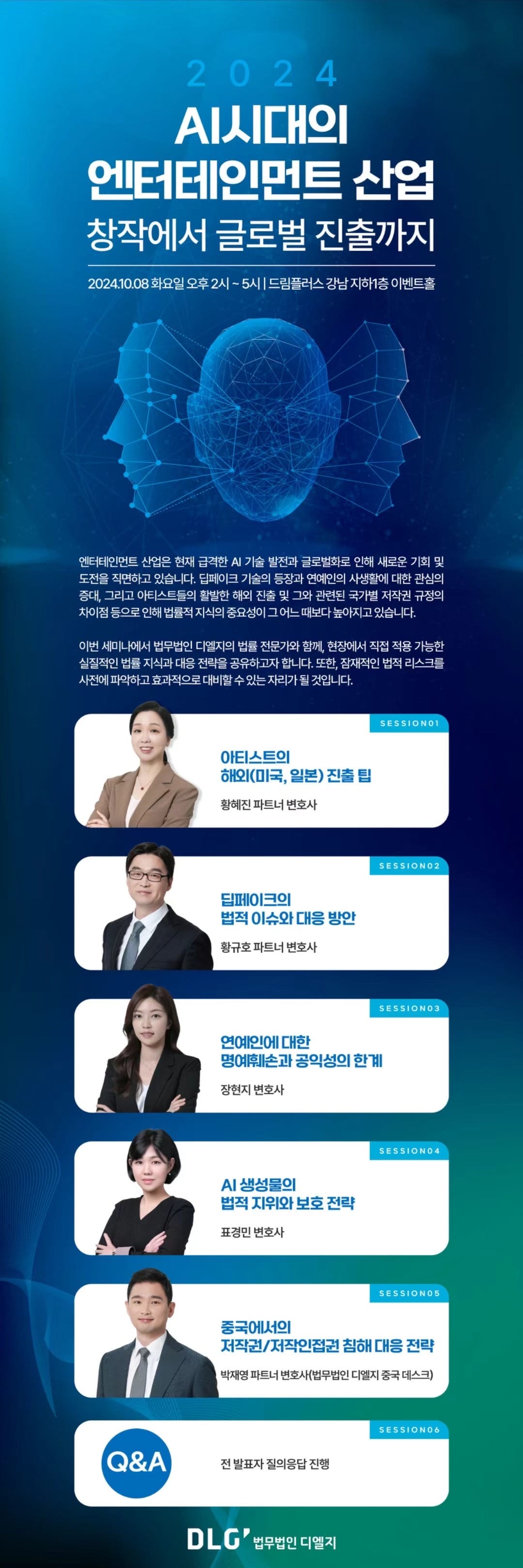2024.10.8. 법무법인 디엘지 주최로 열린 'AI시대의 엔터테인먼트 산업:창작에서 글로벌진출까지' 세미나에서, 5개의 강의 중 하나로 '중국에서의 저작권/저작인접권 침해 대응 전략'에 대해 강의했다.