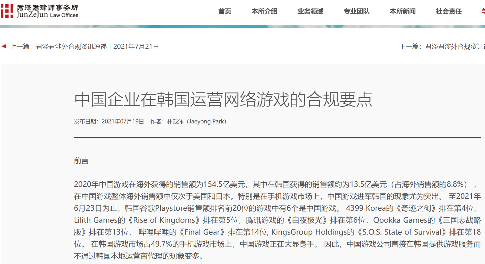 2021년 7월 21일, 회사(쥔쩌쥔변호사사무소) 홈페이지에 뉴스레터 형식으로 게재한 첫 중문 아티클이다. 중국 게임사가 한국에 핸드폰 게임을 출시하여 운영하는 사례가 많다는 점에 착안하여, 한국에서 게임을 운영하기 위해 필요한 분야별 주요 준법 이슈를 정리하였다. 등급분류(연령), (당시에 있었던) 셧다운제, 확률형 아이템 확률 공개(당시 자율 규제 사항) 등을 그림과 함께 설명했다. 훗날 이 글을 읽고 내게 자문 프로젝트를 의뢰한 중국 게임사가 나의 첫 중국 기업 고객이 되었다.
